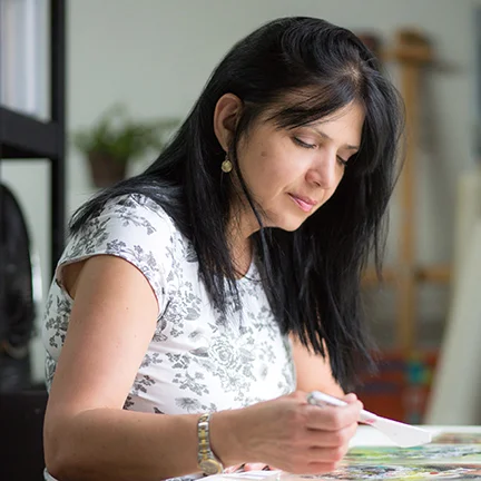 After several years of a successful career in in terminational finance, Leonor decided to pursue another profession in the arts, converging her passion for both areas. In her studio she has refined her process of photography-based dynamic painting, creating rich geometrical compositions.